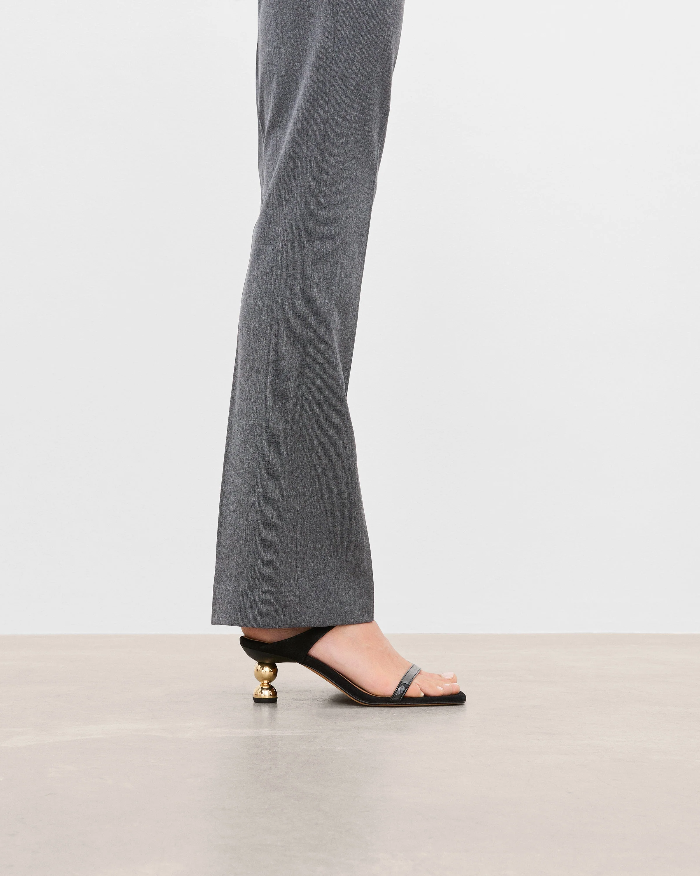 The Ali is an open toe sandal featuring a sophisticated shaped heel with a metalized finish. It has a cushioned footbed that adds comfort to this elevated style. The upper is crafted from a mix of materials - black suede and shiny printed snake leather accents. The Ali sandal boasts a contemporary square toe shape, giving it a fashion-forward look.